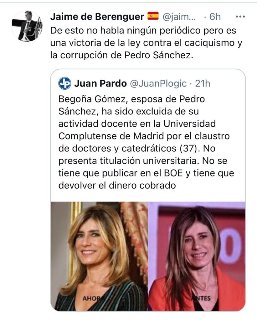 Además, Juan Pardo no aporta ninguna prueba de sus afirmaciones. En respuesta a un usuario de Twitter que preguntaba por la fuente de la noticia, ha afirmado que "el viernes se la expulsó" pero, como decimos, la UCM niega que haya sido cesada. También le dice al usuario que entre "en claustro universidad complutense", que es un órgano de representación de la comunidad universitaria de la UCM. Sin embargo, no encontramos ninguna referencia de que el Claustro Universitario de la UCM haya "expulsado" a Begoña Gómez.