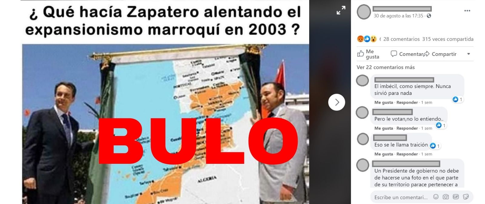 Circula una imagen en Facebook del expresidente del Gobierno José Luis Rodríguez Zapatero junto al rey de Marruecos, Mohamed VI. En la foto, por la que también nos habéis preguntado a través de nuestro chatbot de WhatsApp (+34 644 229 319), se puede ver cómo destapan un mapa en el que parte de la mitad sur de España está pintada del mismo color que el territorio marroquí, dando a entender que pertenece a Marruecos. El texto que acompaña a la propia imagen dice "¿qué hacía Zapatero alentando el expansionismo marroquí en 2003?". Es un bulo. La imagen ha sido manipulada para añadir el mapa. En la foto real lo que destapan es una placa conmemorativa a las víctimas del atentado del 16 de mayo de 2003 en Casablanca.