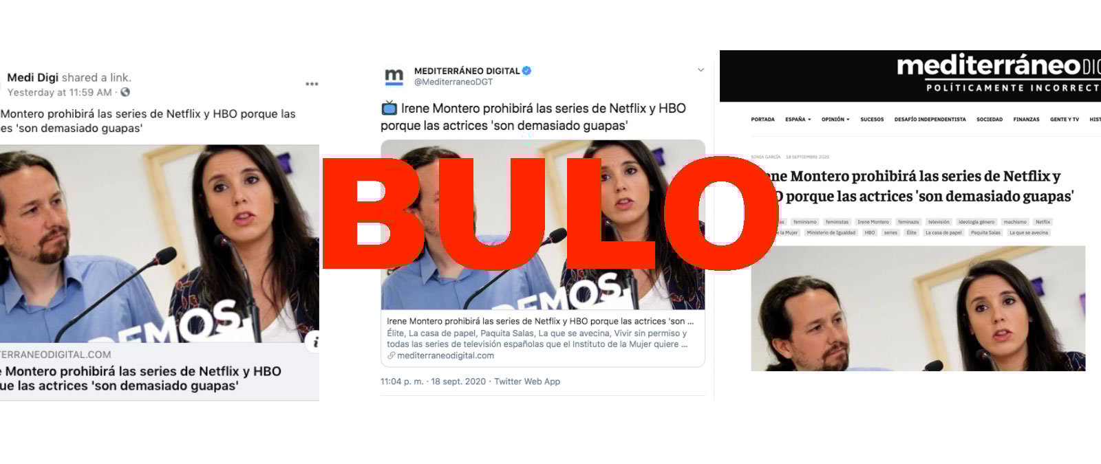 La web Mediterráneo Digital ha publicado un contenido titulado: "Irene Montero prohibirá las series de Netflix y HBO porque las actrices son demasiado guapas". Es un bulo. Mediterráneo Digital no vuelve a hacer referencia a la supuesta prohibición en todo el texto e Irene Montero no ha hecho ninguna declaración pública de esas características. Además, el informe del Instituto de la Mujer en el que se basa la web tampoco propone que las series sean prohibidas. Desde el Ministerio de Igualdad nos indican que "ni la ministra ni el Ministerio tiene ni tendrá planes para prohibir series o plataformas".