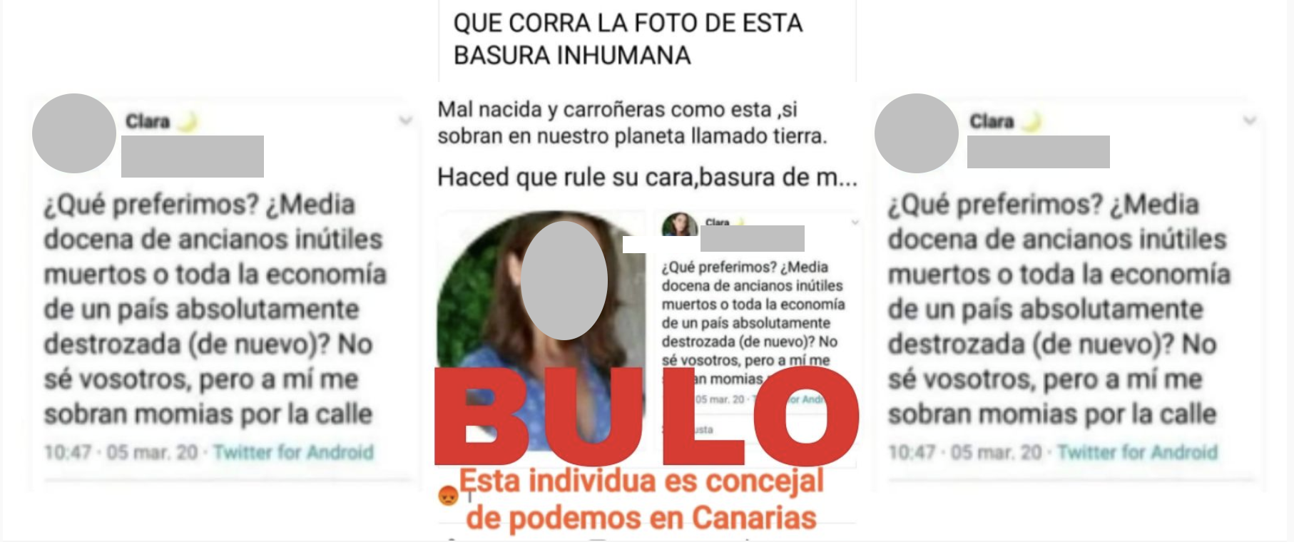 "¿Qué preferimos?, ¿Media docena de ancianos inútiles muertos o toda la economía de un país absolutamente destrozada (de nuevo)? No sé vosotros, pero a mí me sobran momias por la calle". Este mensaje se difunde asegurando que se trata de Clara G., una supuesta concejala de Podemos en Canarias. Es un bulo. El tuit fue real, pero no es de ninguna concejala de Podemos en Canarias.
