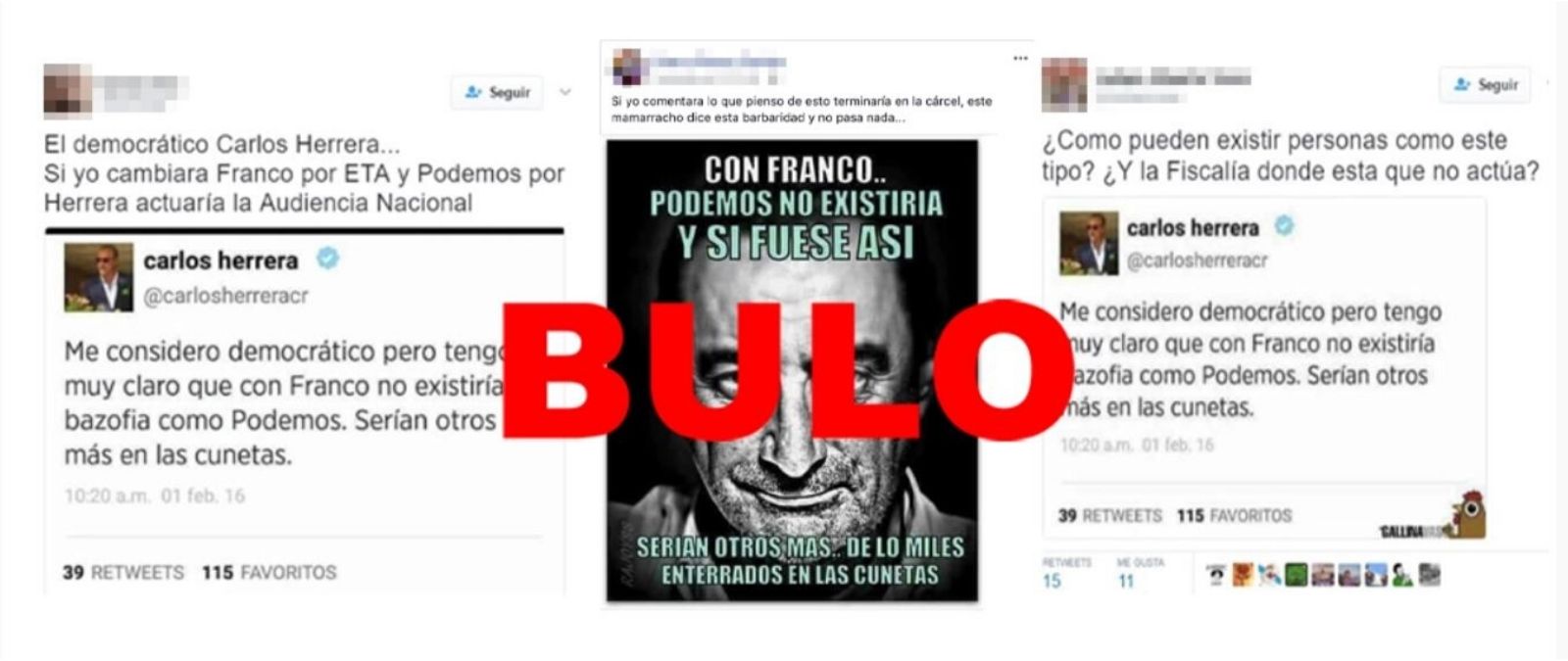 Nos habéis preguntado si es cierto que Carlos Herrera ha dicho que "con Franco no existiría bazofia como Podemos. Serían otros más en las cunetas". Es un bulo antiguo que vuelve a circular. Se mueve siempre la misma captura, el tuit no aparece publicado y Herrera negó que fuese cierto.