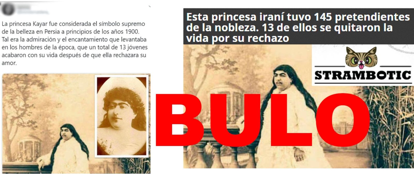 Cada cierto tiempo se vuelve a viralizar la misma historia: dos fotos antiguas de una mujer que supuestamente era considerada un símbolo de belleza en la Persia del comienzos del siglo XX. Se trataría de la princesa persa Kayar o Qajar, quien se supone tuvo numerosos pretendientes, de los cuales 13 se suicidaron tras ser rechazados. Es un bulo.