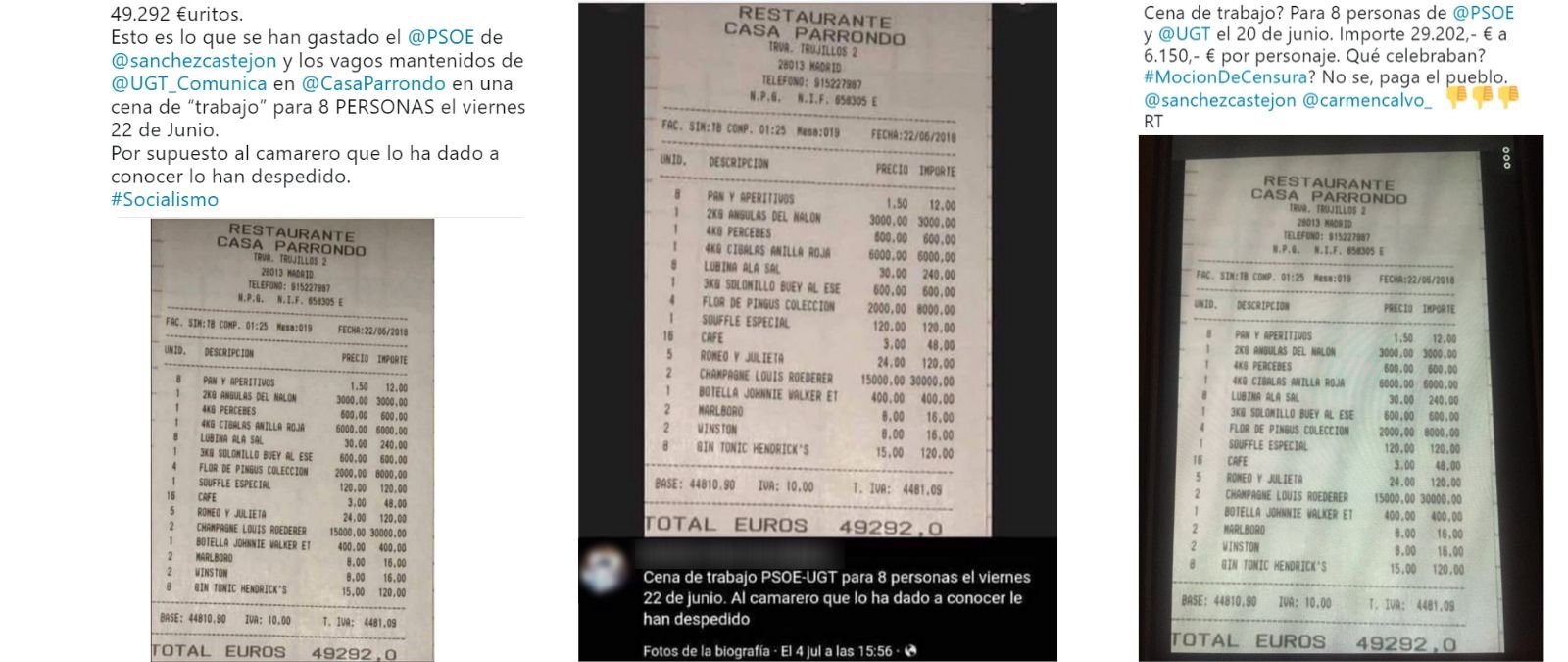 Desde hace meses circula el ticket de una cena por 49.292 euros en el restaurante Casa Parrondo de Madrid que incluye kilos de mariscos y dos botellas de champán de 15.000 euros cada una. El ticket tiene fecha de 22 de junio de 2018 y se suele atribuir en redes sociales a una cena de trabajo de 8 personas del sindicato UGT (Unión General del Trabajo) y del PSOE (Partido Socialista Obrero Español) pese a que los que lo difunden no aportan ninguna prueba. Esto es lo que sabemos.