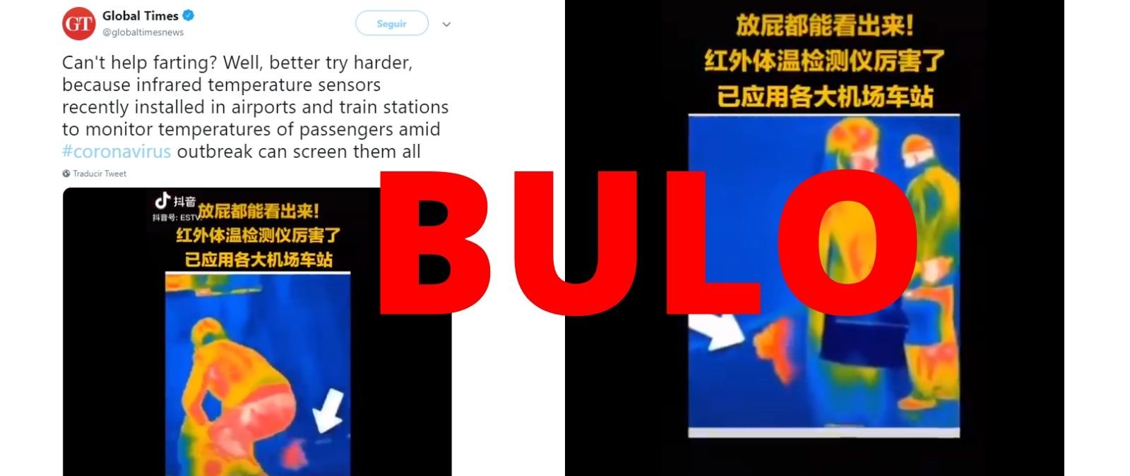 Se ha viralizado una publicación del medio chino Global Times en el que se ve supuestamente tirarse pedos a varias personas y a un perro a través de cámaras térmicas, acompañado del siguiente texto: "¿No puedes evitar tirarte pedos? Bueno, mejor esfuérzate más, porque los sensores de temperatura infrarroja instalados recientemente en aeropuertos y estaciones de tren para monitorizar las temperaturas de los pasajeros en medio del brote de #coronavirus pueden detectarlos todos". Es un bulo.