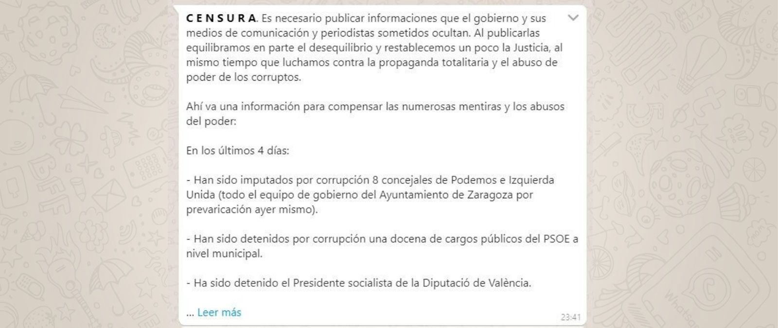 "En toda esta semana, sin embargo, no ha habido ni un solo programa especial, exclusivas, imágenes de los arrestos, documento gráfico alguno sobre los imputados ni campaña viral alguna sobre ninguno de ellos", continúa esta cadena de WhatsApp que dice que "han sido imputados por corrupción 8 concejales de Podemos e Izquierda Unida" o que "han sido detenidos por corrupción una docena de cargos públicos del PSOE a nivel municipal". Aunque, como hemos dicho, estos casos han ocurrido, tuvieron lugar en el año 2018 y por lo tanto no son actuales.
