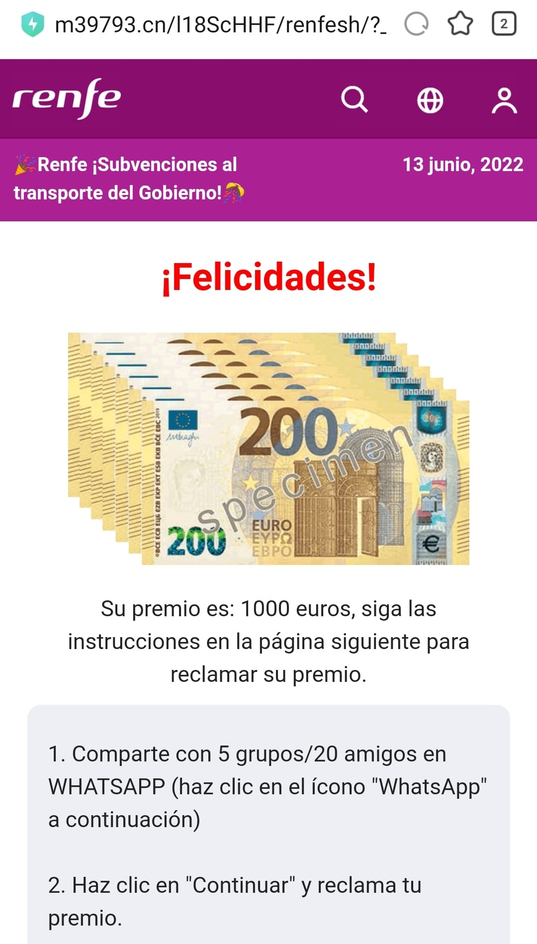 Nos habéis preguntado a través de nuestro chatbot de WhatsApp (+34 644 229 319) por un supuesto sorteo de Renfe en el que se pide que el usuario envíe un SMS a 5 grupos o 20 amigos de Whatsapp para ganar 1.000 euros. Esto corresponde, según el mensaje, a unas “subvenciones al transporte del gobierno”, mientras que otros contenidos aseguran que se trata de una subvención por el "82 aniversario" de la empresa. Pero esto es phishing: Renfe no está sorteando dinero a través de esta supuesta promoción.