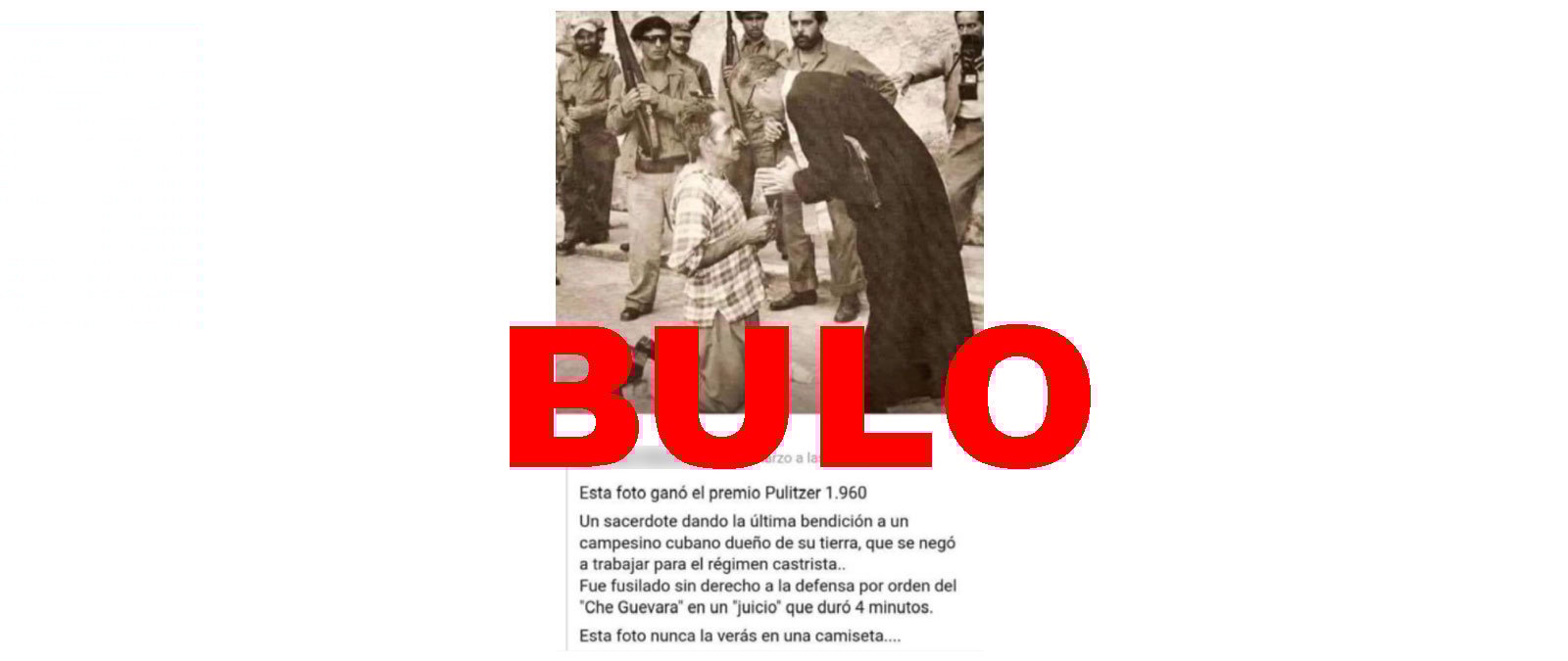 Está circulando por las redes la foto de un supuesto "campesino cubano" que estaría recibiendo "la última bendición" de un sacerdote antes de ser fusilado por orden del Che Guevara al negarse a "trabajar para el régimen castrista". Según el texto que la acompaña, la imagen habría sido premiada también con el Pulitzer en 1960. Sin embargo aunque es cierto que ganó ese galardón, es un bulo que fuera un campesino o que lo fusilaran por ese motivo: tanto el autor de la imagen como el sacerdote que aparece en ella, así como las agencias United Press International (UPI) y Getty Images, los organizadores de los premios Pulitzer y la Revista Bohemia aseguran que el fusilado, llamado Jose Cipriano Rodríguez, había sido cabo del Ejército del que fuera presidente de Cuba Fulgencio Batista y no un "campesino cubano" que se negó "a trabajar para el régimen castrista".