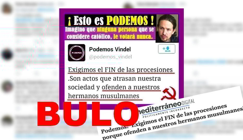 "Exigimos el fin de las procesiones. Son actos que atrasan nuestra sociedad y ofenden a nuestros hermanos musulmanes". Es una publicación que se mueve cada Semana Santa como si fuera de una cuenta oficial de Podemos, pero se trata de un bulo: la cuenta que lo publica es @podemos_vindel, una cuenta trol que actualmente se encuentra suspendida, y cuyo tuit ya desmentimos en 2017 en Maldita.es.