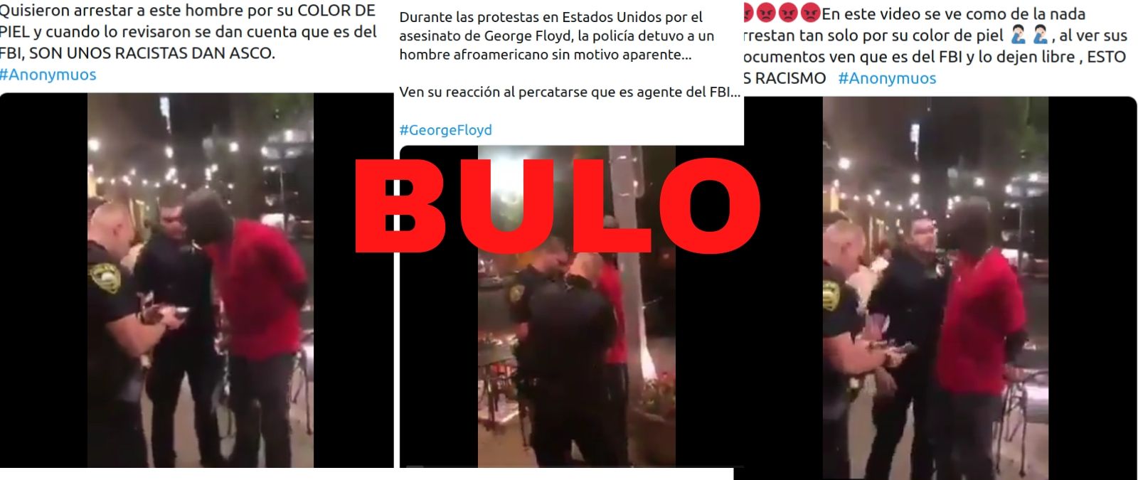 "Quisieron arrestar a este hombre por su color de piel y cuando lo revisaron se dan cuenta que es del FBI". Es el texto con el que se difunde un vídeo en el que dos agentes de policía blancos de Rochester (Minnesota, Estados Unidos) intentan detener a un hombre negro hasta que descubren su identidad al mirar en su cartera, le quitan las esposas y el hombre habla con el superior de los policías sobre lo ocurrido. Se dice que es un agente del FBI (Oficina Federal de Investigaciones, por sus siglas en inglés) y se viraliza como si hubiese ocurrido durante las protestas contra el racismo en Estados Unidos tras la muerte de George Floyd en 2020 en Minneapolis (Minnesota). Es un bulo: ni el vídeo es de 2020 ni hay pruebas de que sea un agente del FBI.