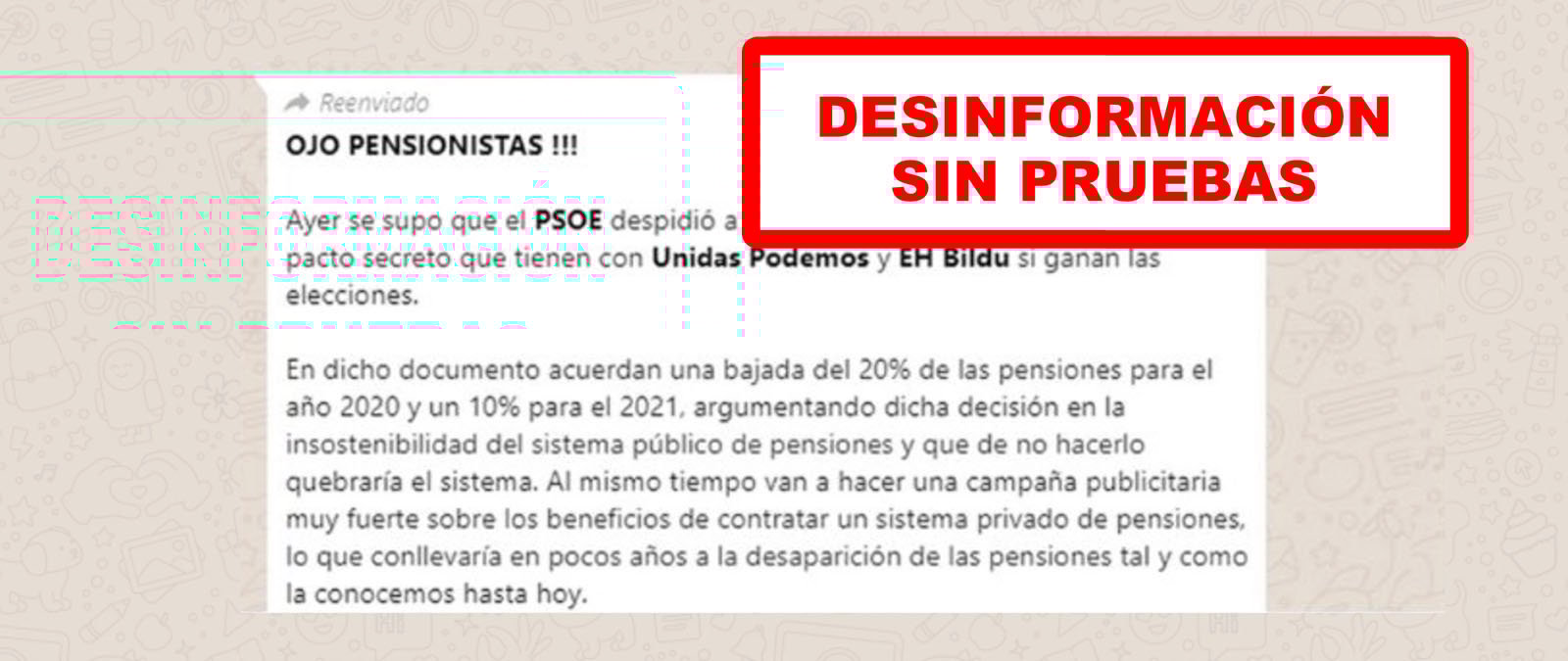 Circula por WhatsApp una cadena que afirma que "ayer se supo que el PSOE despidió a su informático por hacer público el pacto secreto que tienen con Unidas Podemos y EH Bildu si ganan las elecciones". Este supuesto pacto secreto supondría "una bajada del 20% de las pensiones para el año 2020 y un 10% para el 2021" y una campaña publicitaria "sobre los beneficios de contratar un sistema privado de pensiones".