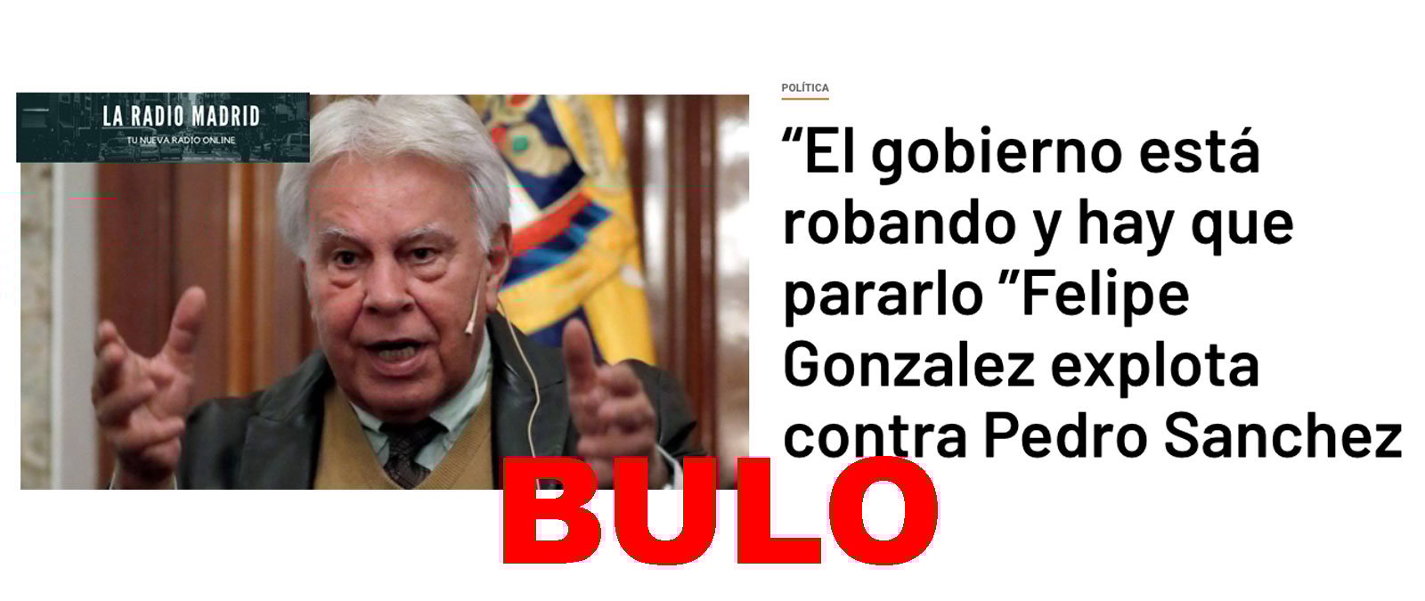 La web La Radio Madrid ha publicado un contenido en el que aseguran que Felipe González ha dicho que "el Gobierno está robando y hay que pararlo". Es un bulo: se trata de un entrecomillado falso ya que el expresidente del Gobierno no ha hecho esas declaraciones.