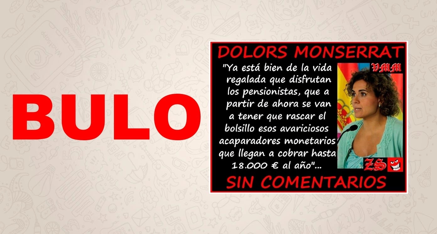 “A partir de ahora se van a tener que rascar el bolsillo esos avariciosos acaparadores monetarios que llegan a cobrar hasta 18.000€ al año”. Circulan contenidos en redes sociales que atribuyen esta frase a Dolors Montserrat, portavoz del Partido Popular en el Congreso de los Diputados de 2018 a 2019. Pero es un bulo: Montserrat nunca ha pronunciado estas palabras. Fue José María Izquierdo en el programa de la Cadena SER 'Hoy por Hoy', llamada 'El ojo izquierdo', emitido en enero de 2017 quién dijo eso.