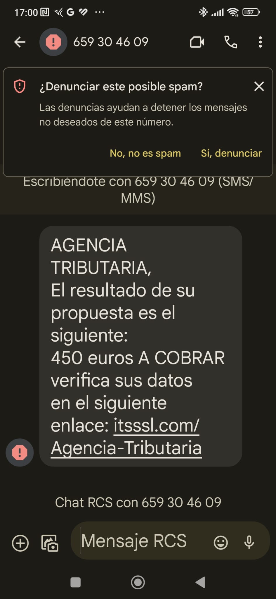 “Agencia Tributaria. El resultado de su propuesta es el siguiente: 450 euros a cobrar”. Este es el SMS que supuestamente está enviando el organismo a los contribuyentes. El mensaje de texto incluye un enlace para que el usuario supuestamente verifique sus datos. Sin embargo, se trata de un caso de smishing: los timadores se hacen pasar por la Agencia Tributaria a través de SMS con el objetivo de hacerse con nuestros datos personales y bancarios.
