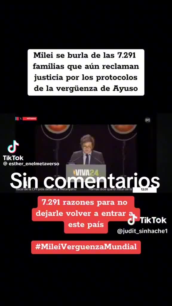 “Así se refirió a los 7291 ancianos víctimas de la gestión de las residencias de Ayuso. En las teles te lo están ocultando porque supera todo lo tolerable y lo protegen”. Circula en redes un vídeo del presidente de Argentina, Javier Milei, durante el acto organizado por Vox en Madrid el 19 de mayo de 2024, en el que se le escucha decir supuestamente que “algunos intentan afear a la presidenta Ayuso por los 7.291 ancianitos pelotudos que se murieron sin asistencia por no tener un seguro privado”.