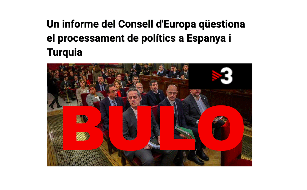 TV3 ha publicado un contenido en el que se asegura que el Consejo de Europa ha publicado un informe donde se "cuestiona el procesamiento de políticos en España y Turquía". No es cierto: el escrito es de un miembro de la Asamblea que da su opinión sobre la situación, pero no es una postura oficial del Consejo de Europa.