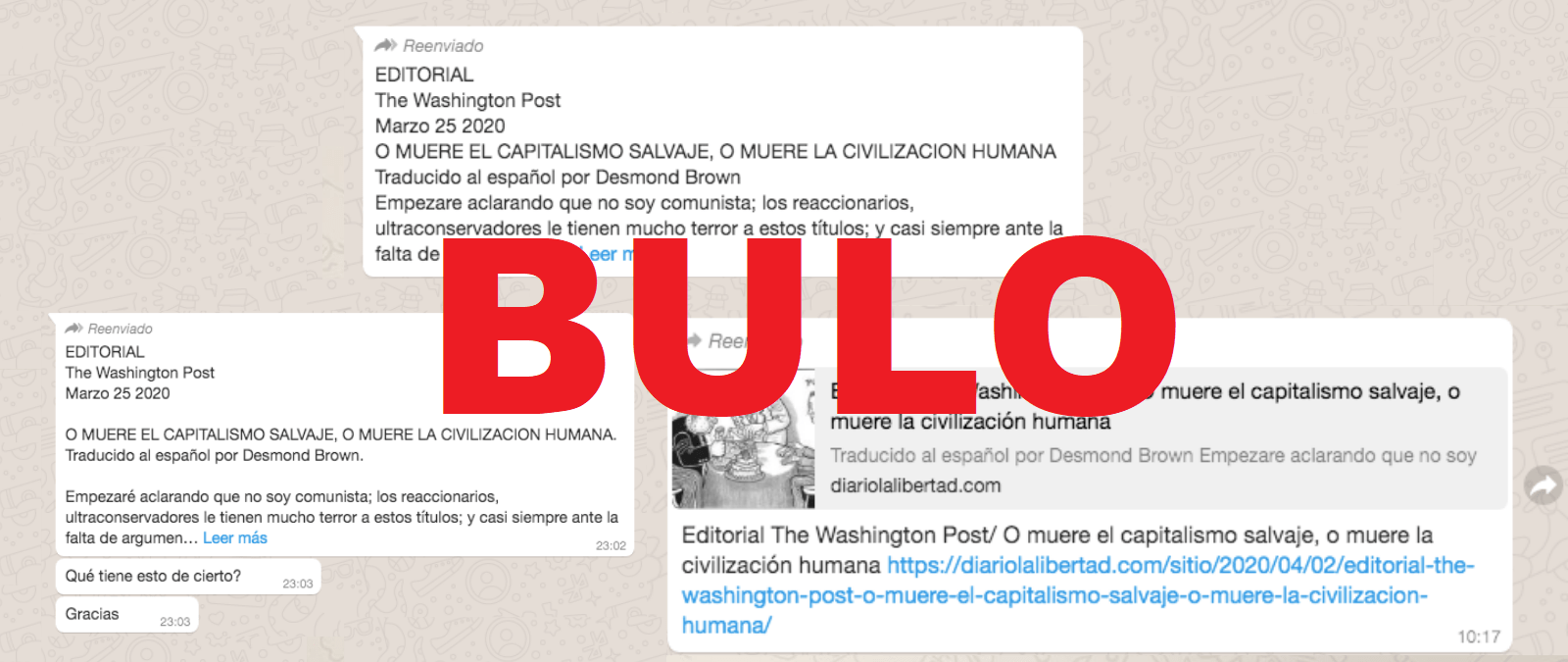“O muere el capitalismo salvaje o muere la civilización humana”. Circulan contenidos que aseguran que este es el título de un artículo de opinión “sobre el capitalismo salvaje” publicado por The Washington Post en marzo de 2020 y "traducido al español por Desmond Brown". Es un bulo: el medio americano no ha publicado una editorial similar al que se mueve en la cadena de WhatsApp cuyo título o contenido sea "O muere el capitalismo salvaje o muere la civilización humana".