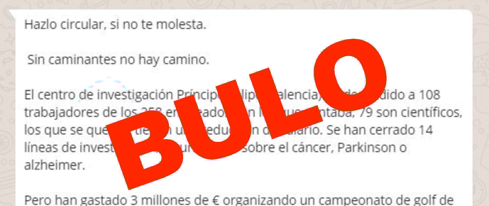 “El Centro de investigación Príncipe Felipe (CIPF) se ha despedido a 108 trabajadores de los 258 empleados con los que contaba, 79 son científicos". Circulan contenidos que aseguran que el catedrático de Fisiología de la Universidad Complutense de Madrid, Vicente Lahera, afirma que el CPIF ha despedido a más de un centenar de trabajadores. Pero es un bulo: ni ahora ni en 2017, cuando publicamos nuestro primer desmentido sobre este tema, se ha despedido a 108 personas, los recortes se produjeron en el año 2011.