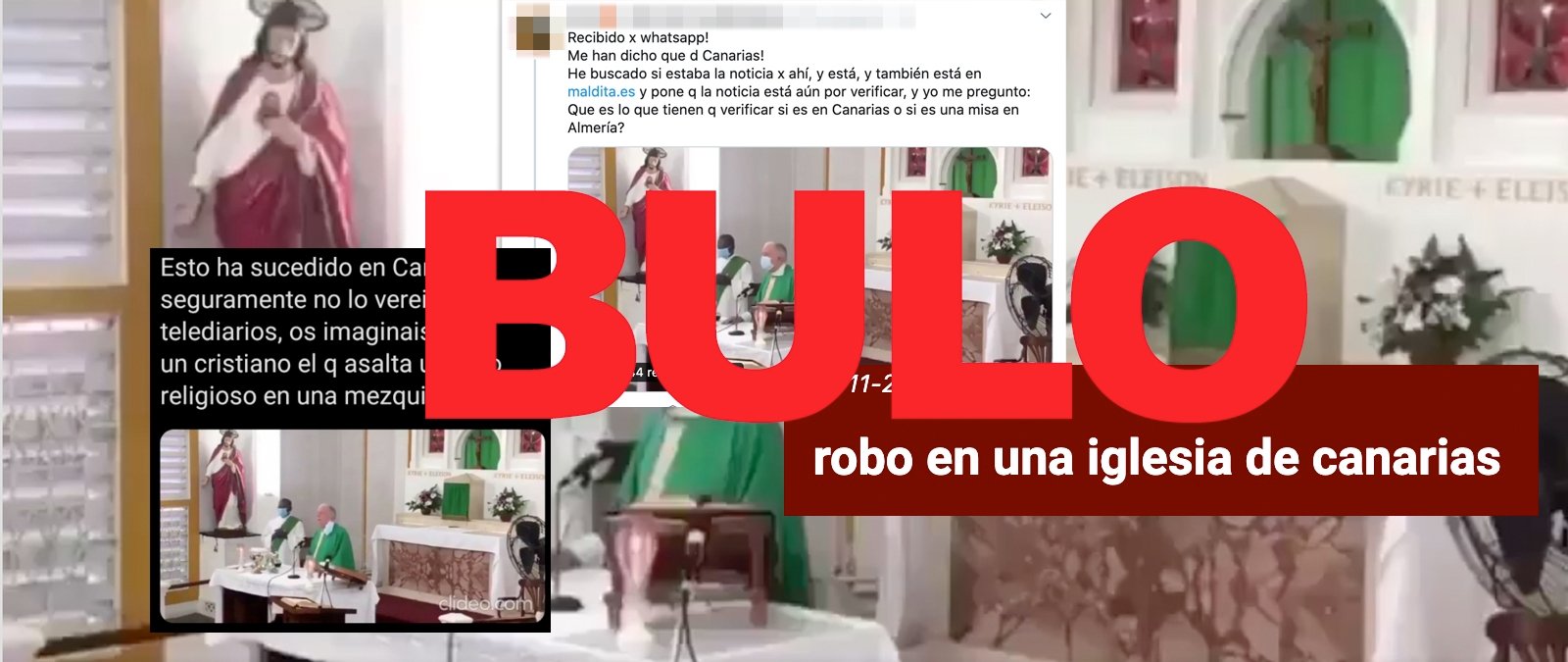 En el vídeo que se está difundiendo se oye de fondo a una mujer decir "mirad esto, esto ha ocurrido en una parroquia de Canarias, España, mientras se estaba dando una misa" y acabar diciendo que "es más cómodo mirar para otro lado, fingir que no pasa nada, que no hay ningún problema y decir que el tema de la inmigración ilegal descontrolada en Canarias pues es un bulo y que vienen aquí a ganarse la vida honrada y pacíficamente". Es un bulo que haya sucedido en Canarias, tampoco ha sucedido en ninguna parroquia en España.