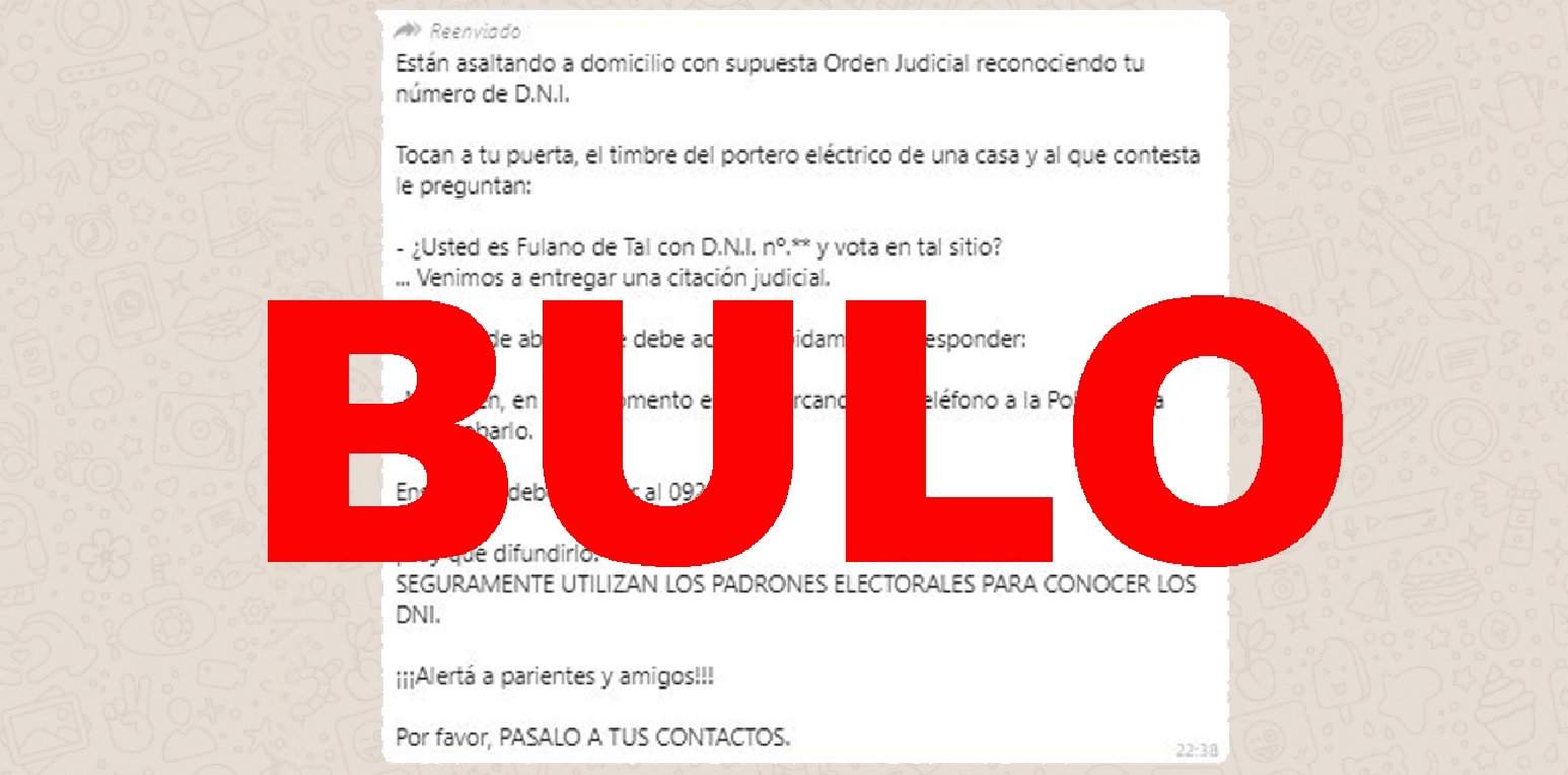 En el mensaje que se ha vuelto viral se afirma que unas personas están llamando a los telefonillos y, para que les abras, te avisan de que van a entregarte una orden judicial. Afirman que te dicen tu número de DNI, tu "cédula de identidad" o tus datos del padrón. Sin embargo, no hay ninguna alerta por estos robos. El Grupo de Delitos Telemáticos de la Guardia Civil ya lo desmintió en su cuenta de Twitter, afirmando que no se tiene conocimiento de que "esto esté sucediendo en nuestro país".