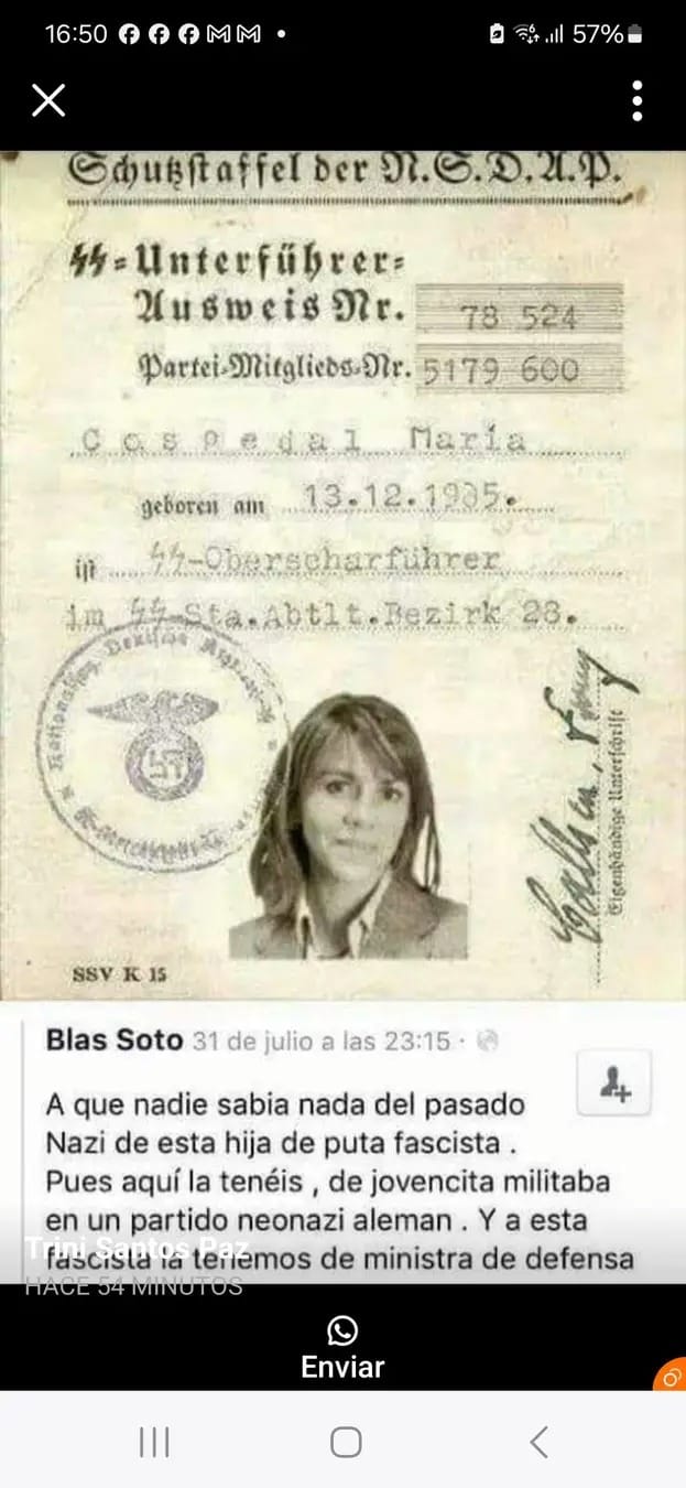 Lo que circula: una imagen de una tarjeta de identificación del Partido Nacionalsocialista Obrero Alemán (NSDAP, por sus siglas en alemán), más conocido como Partido Nazi, en el que aparece la exsecretaria general del Partido Popular, María Dolores de Cospedal, como supuesta militante.