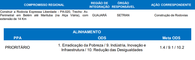 Mención a “Rodovía Expressa Liberdade” (autopista Liberdade) en la revisión del plan plurianual de 2022 del Gobierno de Pará.