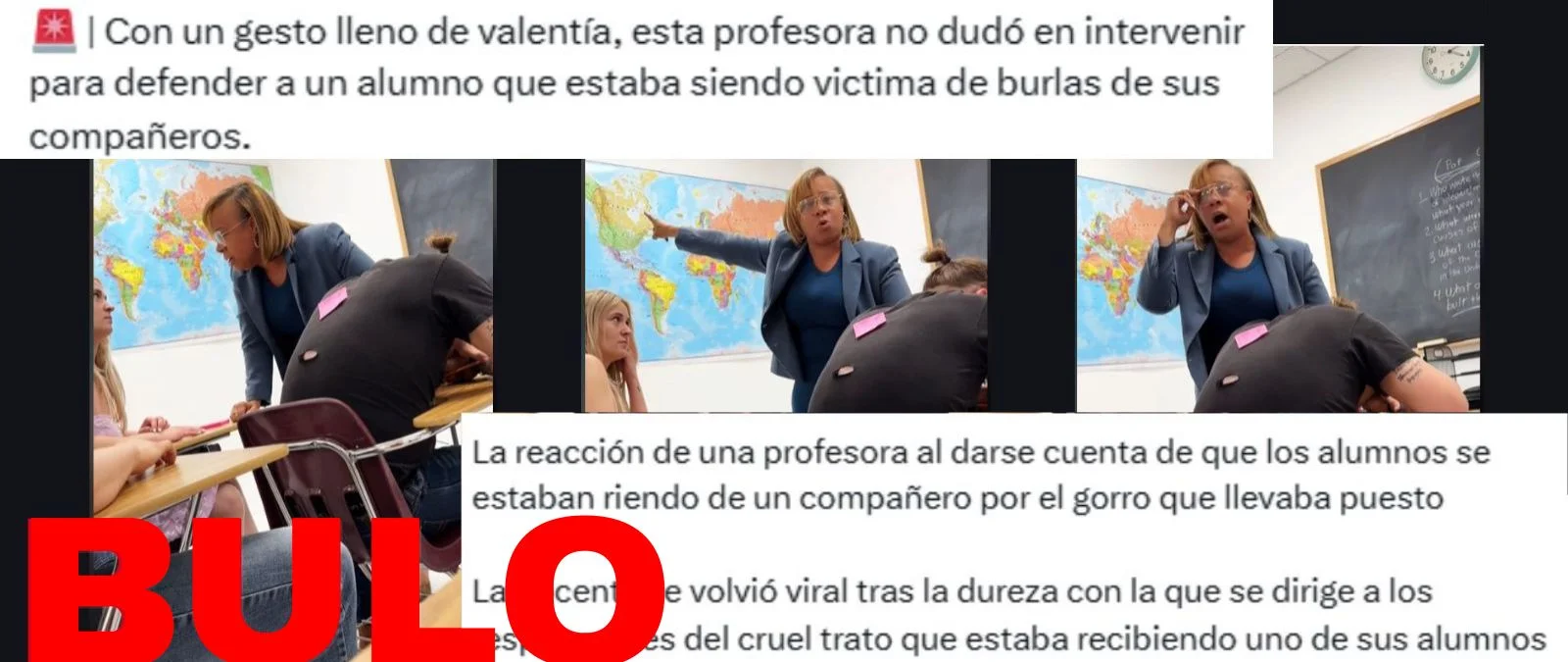 Qué circula: se comparte un vídeo donde se ve a una profesora regañando a sus alumnos por hacerle bullying a uno de sus compañeros. Se difunde como si se tratara de una situación real, con mensajes como “con un gesto de valentía, esta profesora no dudó en intervenir (...)”.