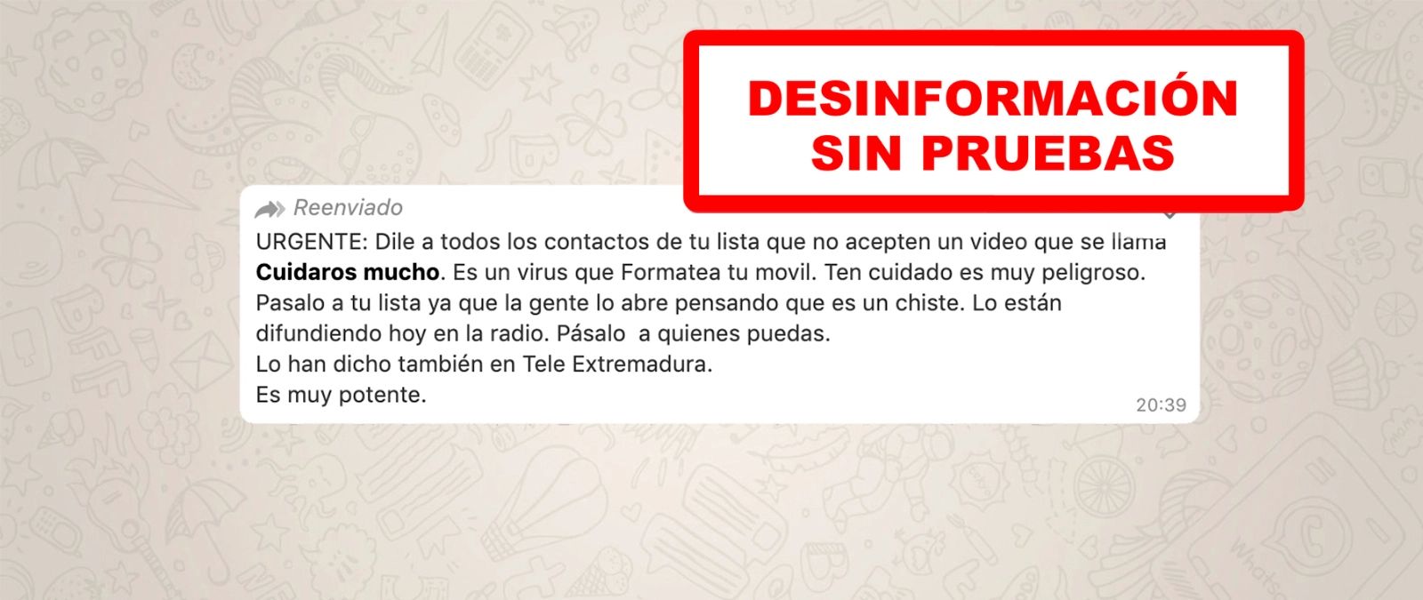 • Circula desde 2020 una cadena de WhatsApp que alerta sobre un vídeo llamado “Cuidaros mucho” que, supuestamente, formatea tu móvil si lo “aceptas” y pide que adviertas de ello a todos tus contactos