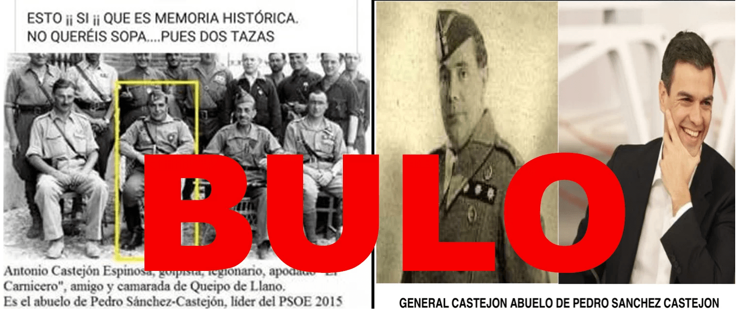Dos imágenes se han difundido en las que se afirma que hay una relación familiar entre el Teniente Coronel Castejón y Pedro Sánchez, líder del PSOE. En una de las fotografías que se está difundiendo se ve a varios militares, uno de ellos señalado en amarillo, junto a un pie de foto en el que se afirma que el señalado es el abuelo de Pedro Sánchez. Además, se afirma que a ese militar, llamado Antonio Castejón Espinosa, se le conocía como "El carnicero" y que era un "golpista" y "legionario".