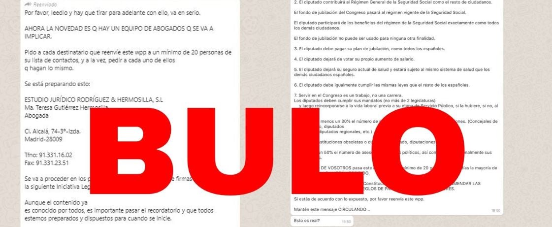 Vuelve a circular una cadena de WhatsApp que afirma que un despacho de abogados está recogiendo firmas para una Iniciativa Legislativa Popular para que los diputados paguen su seguridad social y sólo cobren de mandatos. Pero es un bulo.