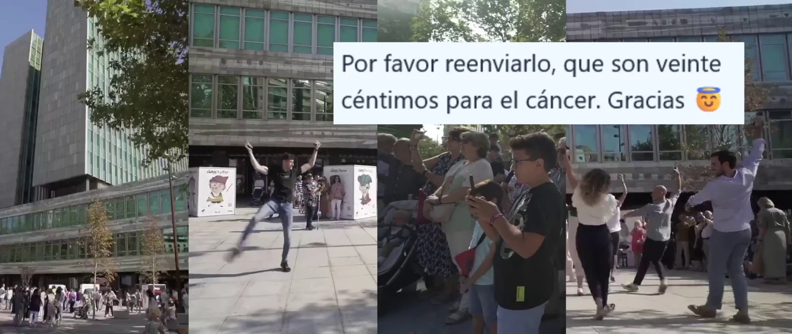 En el vídeo, en el que se ve a un grupo de personas bailar en la calle, se mueve por los canales de mensajería asegurando que si se comparte se donarán 20 céntimos para la lucha contra el cáncer.