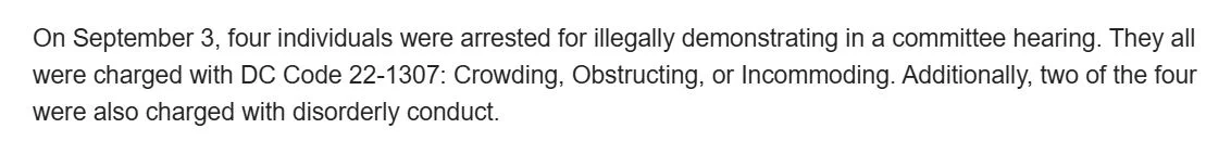 “Antes de empezar, como es habitual, aquí mantenemos una política estricta... Tenemos tolerancia cero con las protestas o con cualquiera que intente comunicarse con el comité o con cualquiera de las personas que testifican aquí. Desde que empecé, implementé la política de que si alguien interrumpe, será arrestado de inmediato, detenido y procesado, y todo lo habitual. Desafortunadamente, solo lo hemos hecho un par de veces, supongo. Eso lo ralentizó considerablemente y seguimos haciéndolo. Además, se le prohibirá la entrada al comité durante un año. Así que, damos la bienvenida al público”.