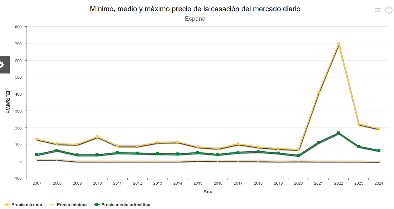 Según el Operador del Mercado Ibérico de Energía (OMIE), el precio medio de la electricidad mayorista en España en 2018 era de 57,29 euros el megavatio-hora (MWh) y en 2024 subió hasta los 63,04 euros el MWh, lo que supone una subida de un 10,04%.