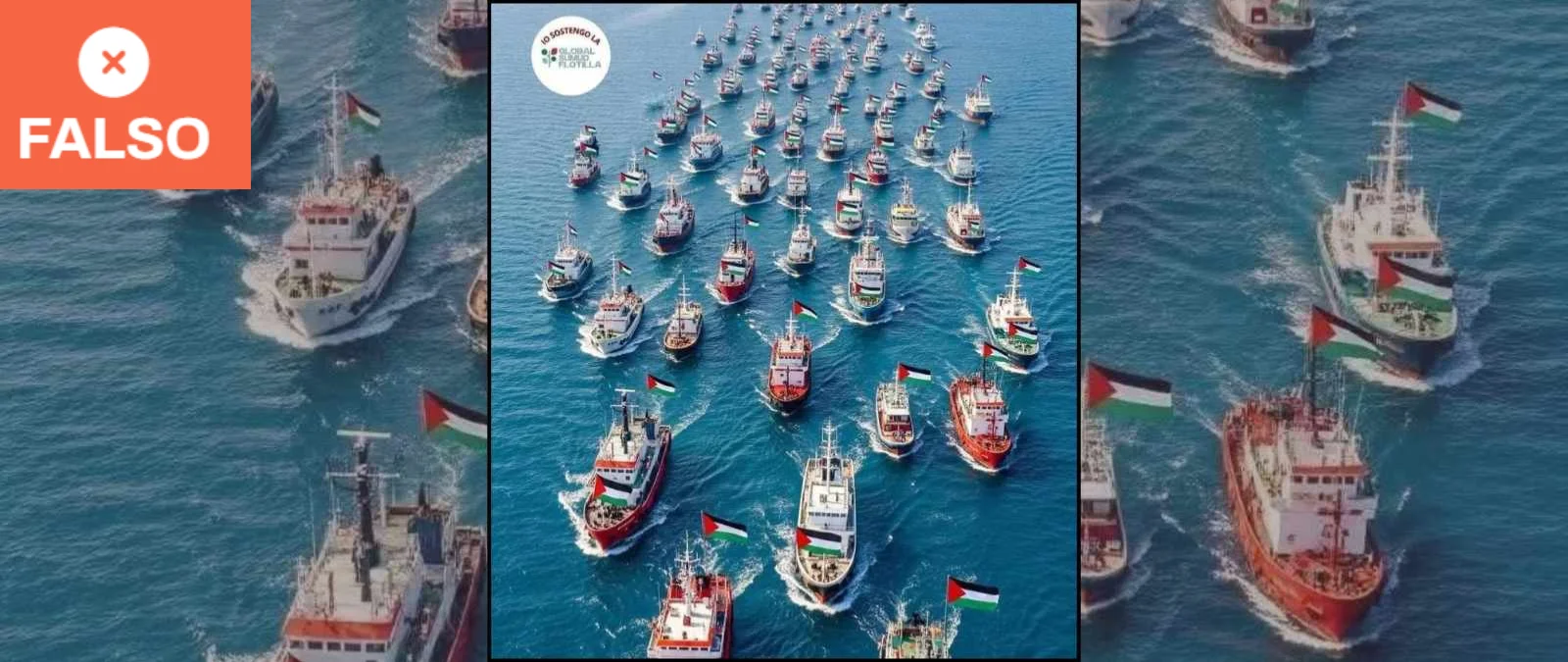 La imagen donde se ven muchos barcos supuestamente de la Global Sumud Flotilla con destino a Gaza navegando por el mar con banderas de Palestina no es real. Tiene indicios de haber sido generada con inteligencia artificial, algo que se puede apreciar en la textura de las olas del mar y la posición de las banderas, que se repite como si se hubieran copiado y pegado.