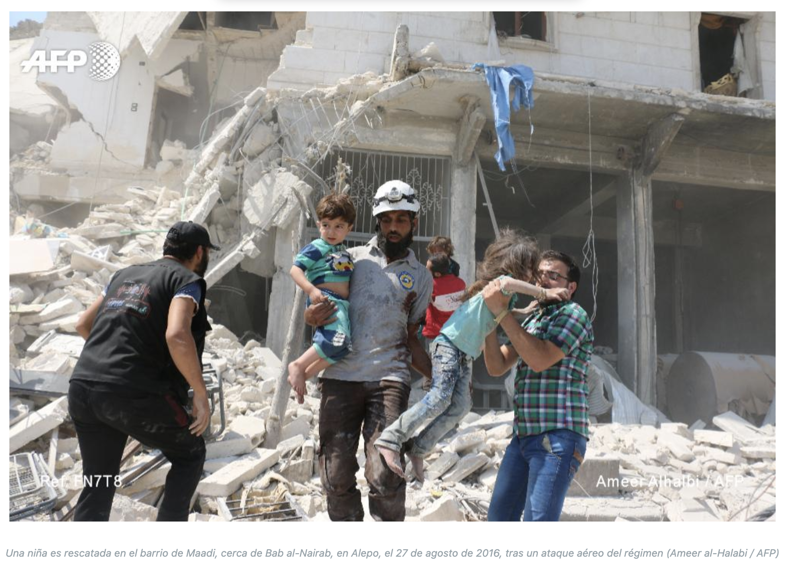 Lo que sabemos: las tres fotos no corresponden a tres ataques distintos. Esta niña había sido rescatada entre los escombros y pasó de unos brazos a otros cuando se tomaron estas imágenes tras un bombardeo en la ciudad siria de Alepo, el 27 de agosto de 2016. Estas tres fotos fueron tomadas por el fotoperiodista Ameer al-Halabi, quien colaboraba con la agencia de noticias francesa Agence France-Presse (AFP).