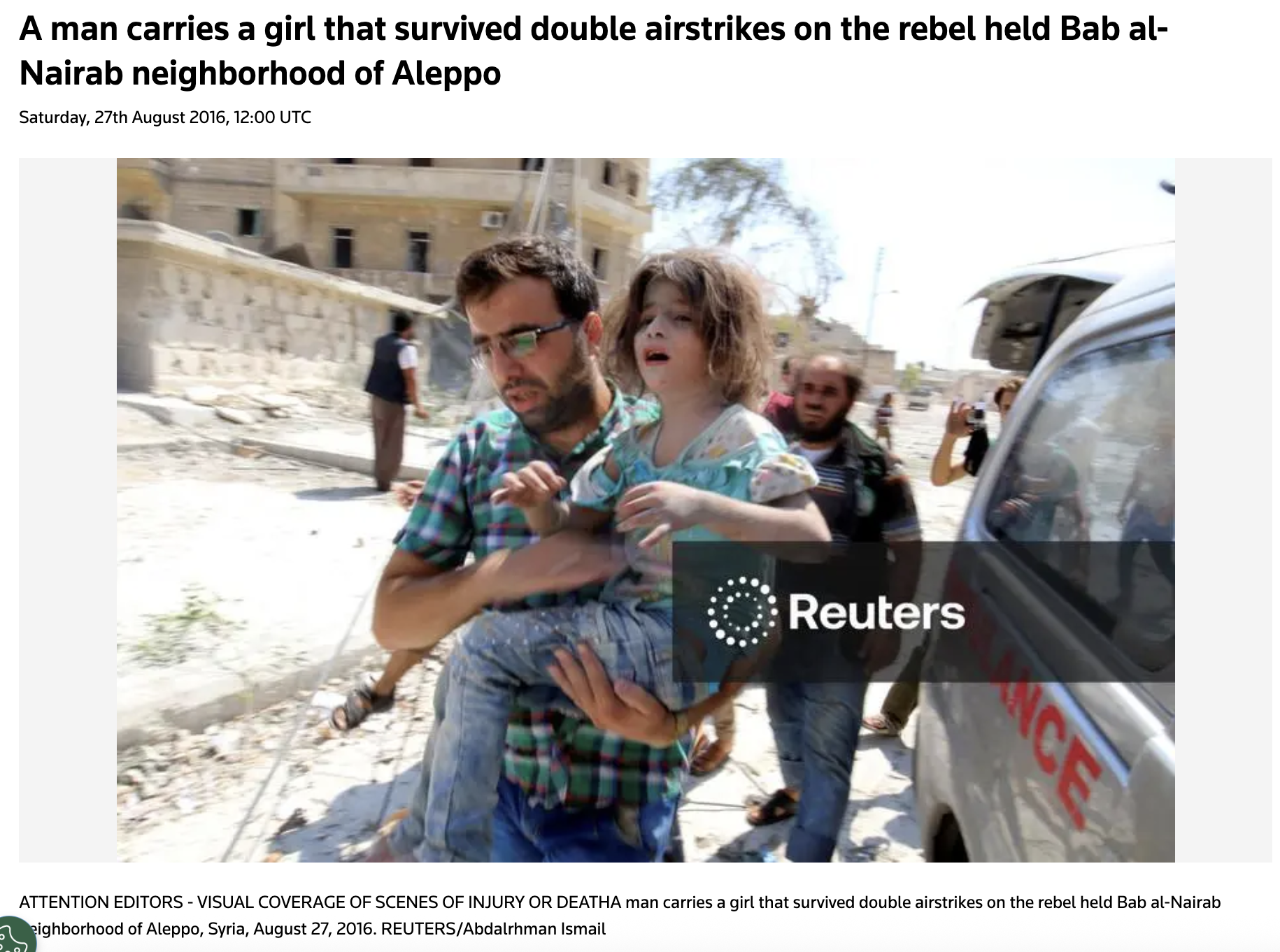 No fue el único fotoperiodista presente en este rescate: Abdalrhman Ismail, para Reuters, también retrató a la pequeña. En los datos que acompañan a la foto se lee: "El hombre lleva a una niña que sobrevivió a los ataques aéreos dobles en el barrio rebelde de Bab al Nairab, Alepo, Siria, el 27 de agosto de 2016".