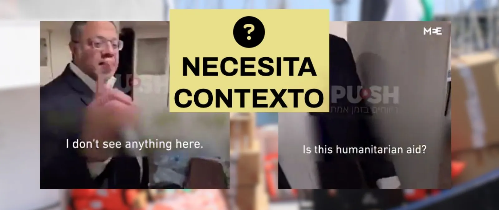 Se han difundido vídeos del Ministro de Seguridad Nacional de Israel, Ben Gvir, y la Policía de Israel donde aparecen supuestamente barcos interceptados de la Global Sumud Flotilla que partieron de Barcelona el 31 de agosto sin ayuda humanitaria en su interior. El 3 de octubre una organización propalestina relacionada con la Flotilla actual publicó fotos y vídeos de “la ayuda prestada a bordo de los buques”. Maldita.es no ha podido verificar la cantidad de ayuda que llevaban los barcos, si parte se consumió en el viaje, ni si el vídeo que publica Israel se grabó sin alterar la carga.
