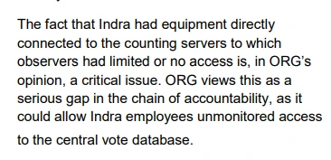 El informe señalaba como “un problema grave en la rendición de cuentas” que empleados de Indra tuvieran acceso a los servidores centrales del recuento, mientras que los observadores externos no podían supervisar esta parte del proceso. Según el documento [pag. 22], esto suponía un riesgo para la integridad electoral, ya que este acceso no estaba monitorizado.