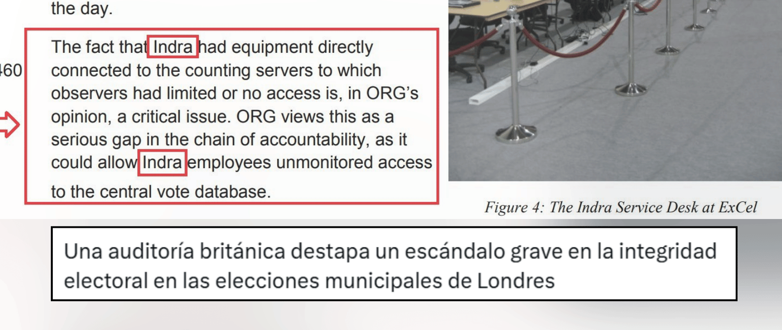 El informe no acusa directamente a Indra de haber manipulado los votos, pero en las conclusiones se afirma [pág. 5] que hay una “insuficiente evidencia para afirmar con fiabilidad que los resultados reflejan la voluntad de los votantes” por la probabilidad de que haya habido votos mal registrados y por la falta de transparencia. Indra no participaba en la organización del proceso electoral ni en la proclamación de los resultados, que son competencia de las autoridades electorales británicas, pero sí en el conteo de los votos emitidos.