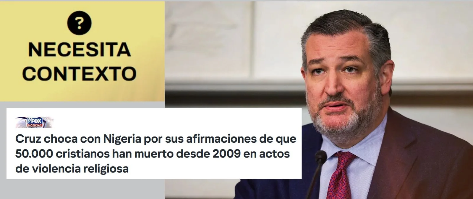 Las afirmaciones de Ted Cruz sobre 50.000 cristianos muertos en Nigeria desde 2009, son declaraciones que dio a Fox News, en las que añadió que “más de 20.000 iglesias y escuelas cristianas han sido destruidas” sin dar fuentes. El ministro de Información y Orientación Nacional de Nigeria, Mohammed Idri, negó las cifras diciendo que "el Gobierno nigeriano lo rechaza. Esto, desde luego, no es cierto". Al respecto, Intersociety señala que desde 2009 ha habido más de “150.000 muertes de civiles indefensos por motivos religiosos” y la “quema o destrucción de más de 18.500 lugares sagrados de culto cristiano, 1.000 santuarios religiosos y 2.500 centros de aprendizaje cristianos/tradicionales” que sumarían 21.000. Desde Maldita.es no podemos verificar de manera independiente esas cifras.