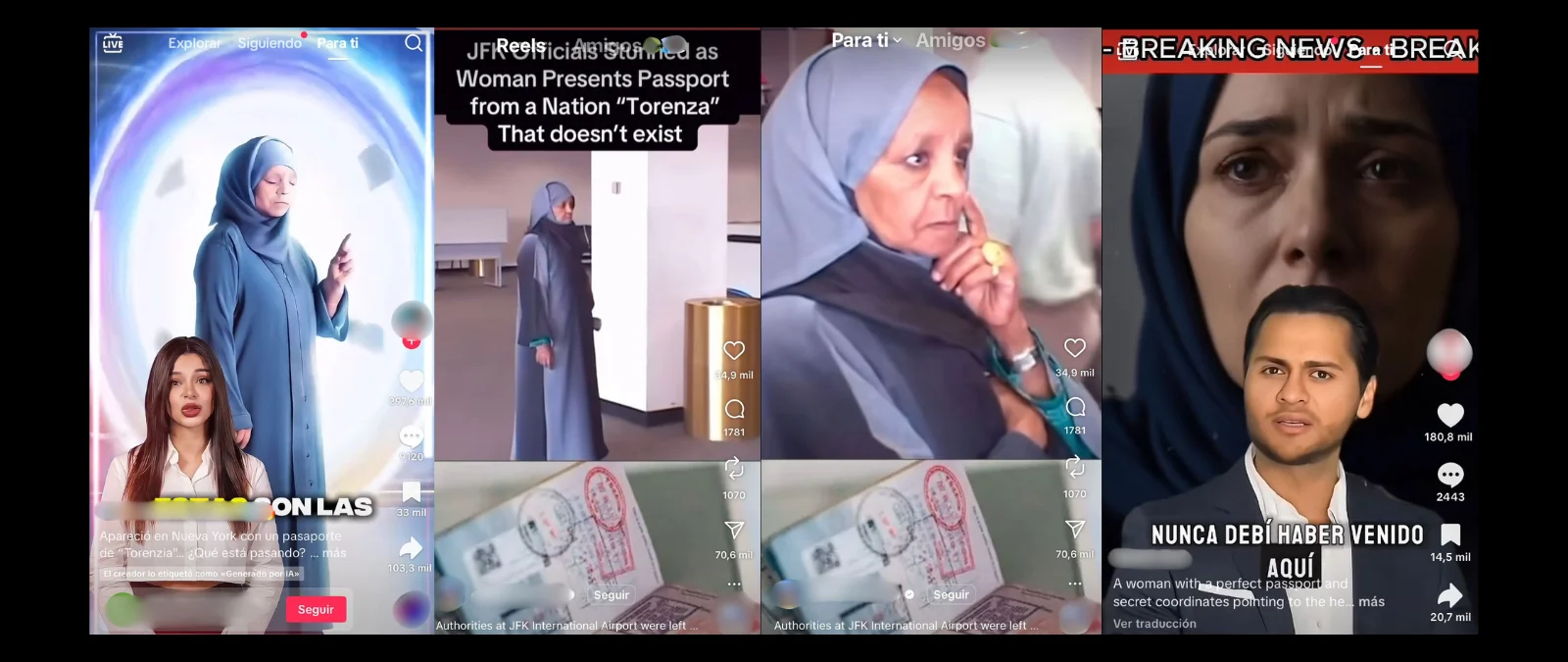 “Una mujer aterrizó en el aeropuerto JFK con un pasaporte de un país que nunca ha existido”. Así comienza un vídeo viral que asegura que una anciana con un pasaporte de un país llamado “Torenza” llegó al aeropuerto neoyorquino. Según el relato, cuando le preguntaron sobre su origen, la mujer habría señalado “este no es mi mundo”. El vídeo utiliza extractos de un programa de televisión y voces creadas con IA que narran esta historia que nunca ocurrió.