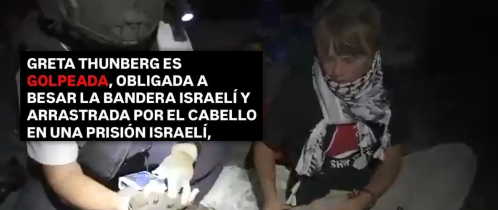 Tras la liberación de los primeros miembros de la flotilla Global Sumud, que pretendía llevar ayuda humanitaria hacia Gaza, Ersin Çelik, uno de los tripulantes turcos de de la flotilla, dijo a CNN Türk el 4 de octubre que “torturaron” y “arrastraron” a Greta Thunberg y le hicieron “besar” una bandera Israelí [min. 7:09]. Otro miembro de la flotilla, el italiano Lorenzo Agostino, dijo a la agencia turca Anadolu ese mismo día que Thunberg fue “humillada, envuelta en una bandera israelí y mostrada como un trofeo”.