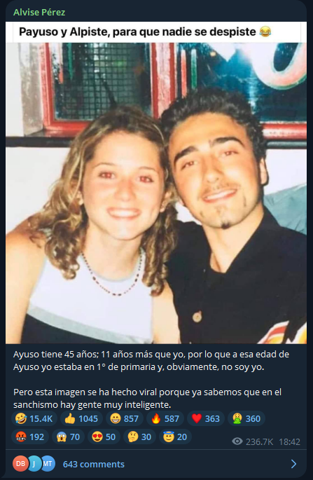 Lo que sabemos: es un bulo. Alvise ha negado a través de su canal de Telegram ser el protagonista de la imagen. Además, la diferencia de edad entre ambos (casi 12 años) hace imposible que el chico de la foto sea Alvise. Díaz Ayuso compartió originalmente la fotografía en Instagram en 2016, y mencionó a un usuario que no es Alvise Pérez.