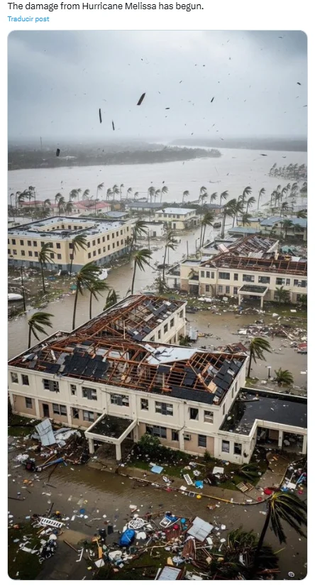 Otro caso es el de una imagen creada con IA que supuestamente muestra Jamaica destruida por la catástrofe. Se publicó por primera vez al menos cuatro horas antes de que el huracán tocara tierra en este país, según explican los verificadores de Lead Stories, miembros del European Fact-Checking Standards Network (EFCSN) al igual que Maldita.es, que han determinado que la imagen fue generada con inteligencia artificial. Rápidamente se viralizó en redes sociales sin etiquetas (aunque en X aparece con una nota de la comunidad que advierte que fue creada con IA).