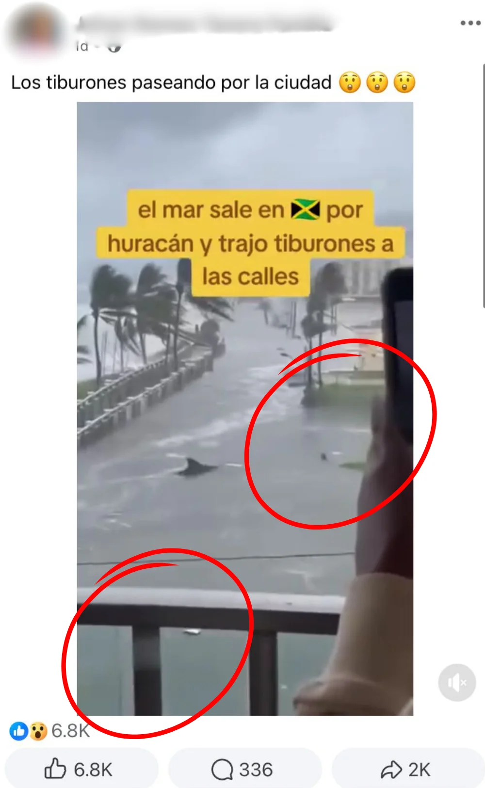 En otros contenidos, las marcas de agua que dejan herramientas de creación de vídeo como Sora parecen haber sido eliminadas o difuminadas. Los verificadores de BBC Verify aseguran que este sería el caso de un vídeo creado con IA que supuestamente muestra cómo una persona graba desde un balcón a dos tiburones que nadan en las calles de Jamaica durante el huracán: “En la parte inferior izquierda del vídeo se aprecia una señal borrosa, probablemente una marca de agua que ha sido ocultada”.