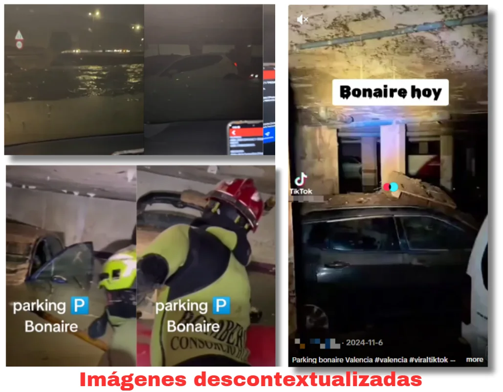 Desde el mismo día de las lluvias torrenciales y desbordamientos (durante las que se llegaron a registrar 184,6 litros de lluvia por metro cuadrado en el municipio valenciano de Turís), centenares de vídeos e imágenes comenzaron a saturar las redes sociales. En los días posteriores se viralizaron publicaciones de las consecuencias de esta DANA en Catarroja, Paiporta, Chiva, Alfafar y otros municipios de la zona. En medio de todas estas imágenes se colaban contenidos desinformadores que aseguraban estar grabados en el parking de Bonaire y que pretendían “demostrar” que sí habían fallecido personas allí dentro. Pero, en realidad, eran imágenes sacadas de contexto que se estaban utilizando para desinformar.
