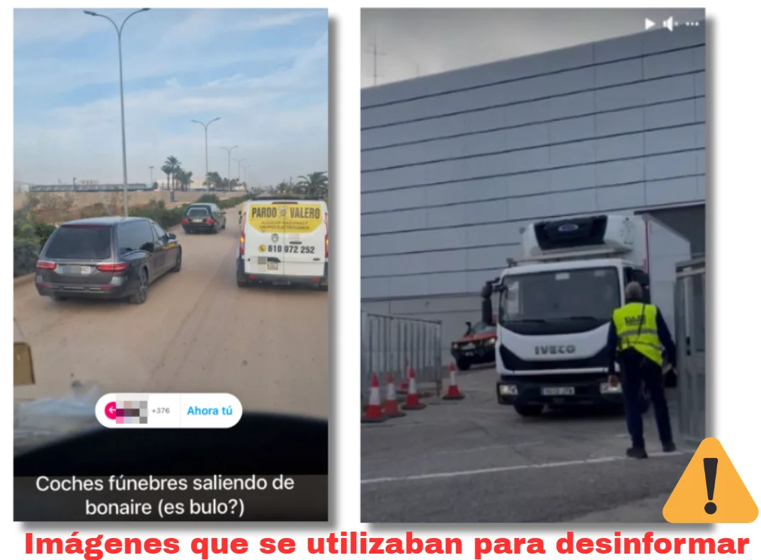 También circularon imágenes de camiones frigoríficos y coches fúnebres que supuestamente se estaban utilizando para transportar los cadáveres que los equipos de búsqueda estaban extrayendo del aparcamiento. De nuevo, ninguna fue grabada cerca de Aldaia. Las primeras se grabaron en el recinto ferial de Valencia, en Paterna, tres días antes de que comenzaran los trabajos en Bonaire; y el segundo ejemplo se corresponde con imágenes del entorno de la sede de los juzgados de la ciudad de Valencia, a casi 20 kilómetros de distancia del centro comercial. Incluso se viralizó una imagen de “un buzo de la UME” junto a mensajes que afirmaban que estaba “llorando” tras ver el interior del parking. En realidad, era un bombero que trabajaba en las instalaciones y en la secuencia completa se puede ver que no estaba llorando.