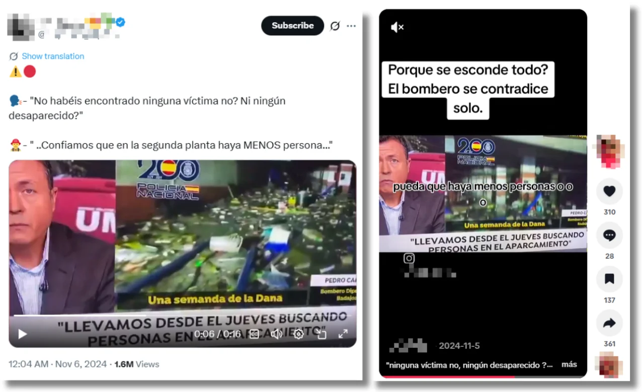 Por ejemplo, uno de los vídeos que se viralizó contenía unas declaraciones de un bombero de la Diputación de Badajoz en el informativo de Antena3 en las que decía que confiaba “en que en las segundas plantas haya menos personas”. Se compartía con mensajes que lo asociaban con Bonaire, pero, en realidad, estaban sacadas de contexto: hablaban del parking subterráneo de un supermercado de Catarroja (Valencia), en el que tampoco se habían encontrado víctimas en ese momento.