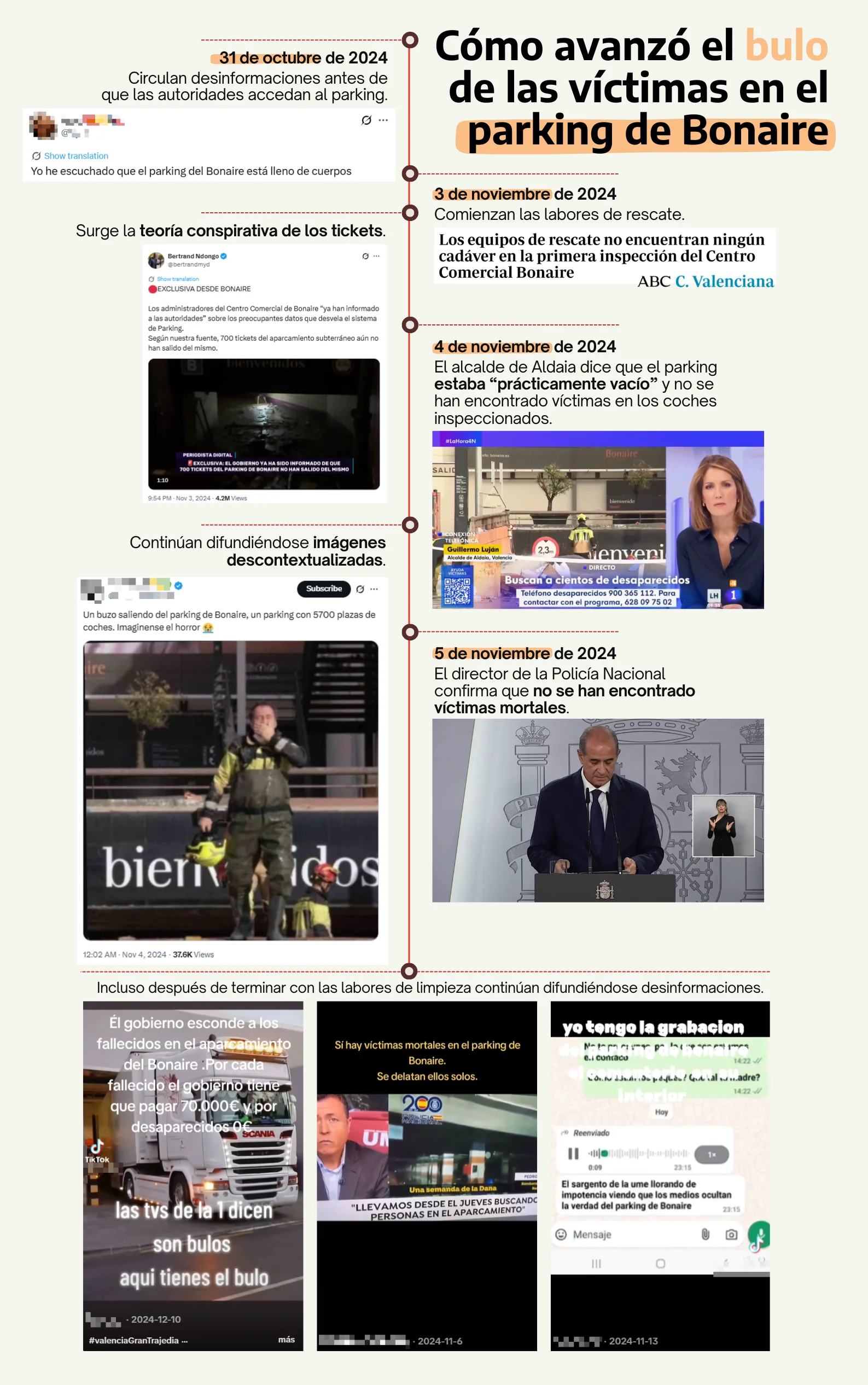 Para construir la teoría de la conspiración que afirmaba que las autoridades estaban ocultando las víctimas de Bonaire hacía falta algo más que imágenes. Con el objetivo de reforzar estas acusaciones, comenzaron a viralizarse falsos testimonios de supuestos testigos y personal que trabajaba en las labores de inspección y limpieza del aparcamiento subterráneo. Estas declaraciones, que se difundían tanto en audio como en vídeo y texto, funcionaban como un argumento de autoridad que algunos usuarios daban por reales y fiables.