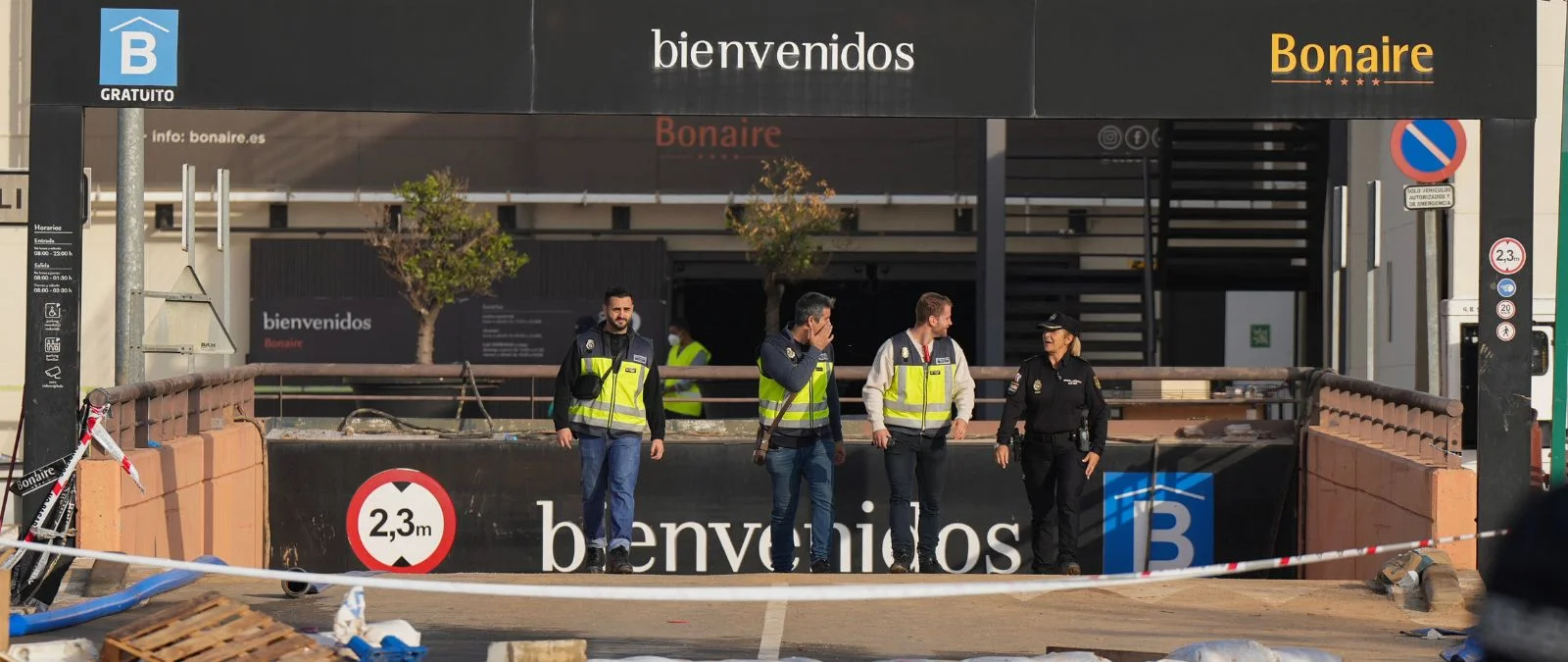 FOTO DE PORTADA: Policías salen del parking del centro comercial Bonaire, en las afueras de Valencia, el 5 de noviembre de 2024, tras la DANA de octubre. (Foto de César Manso / AFP)