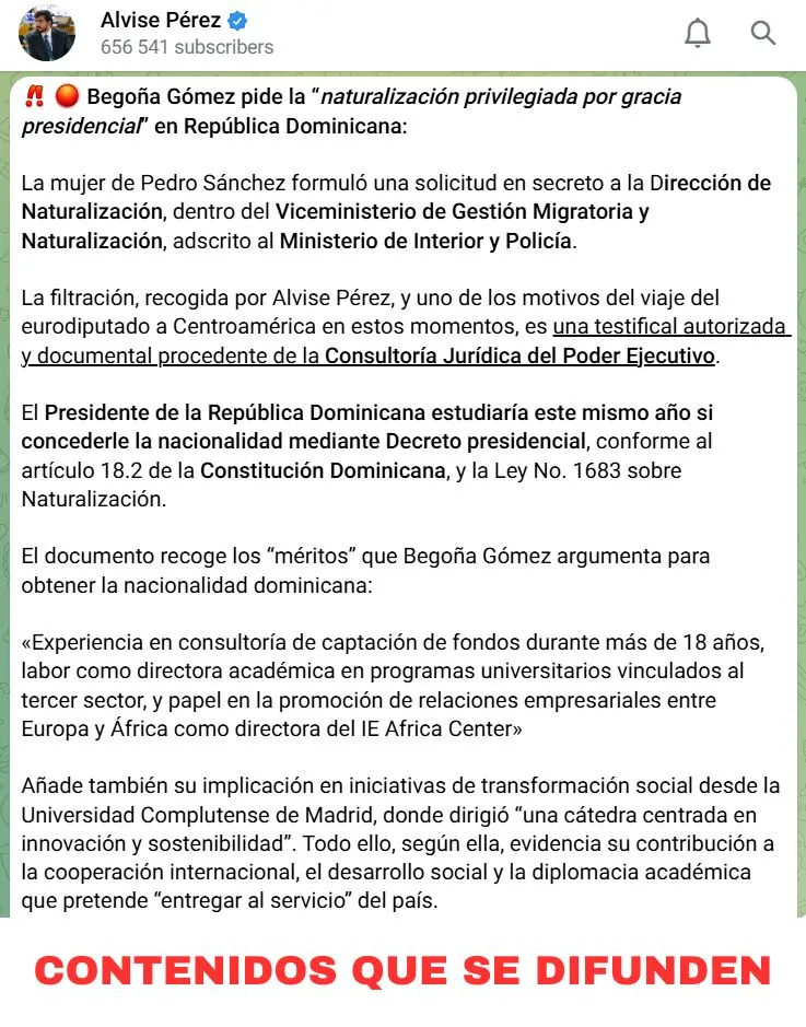 Otro de los contenidos asegura que la mujer del presidente del Gobierno habría pedido la “naturalización privilegiada por gracia presidencial” en la República Dominicana. Esta concesión de la nacionalidad se hace por decreto presidencial. Desde la Dirección de Comunicaciones del Gobierno de República Dominicana añaden a Maldita.es sobre este asunto que al realizarse por decreto del presidente, Luis Abinader, éstos son públicos.